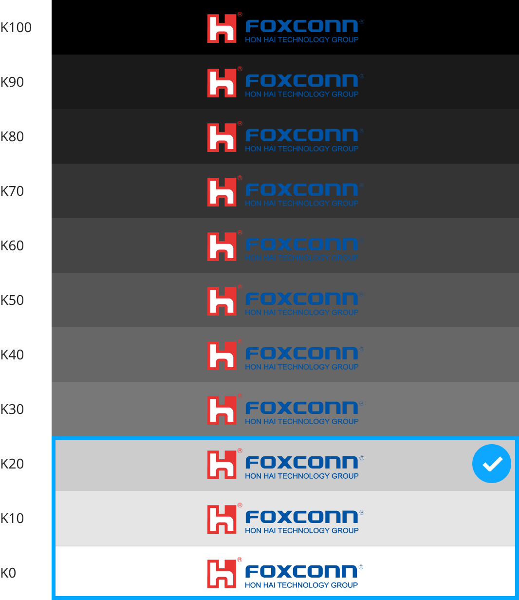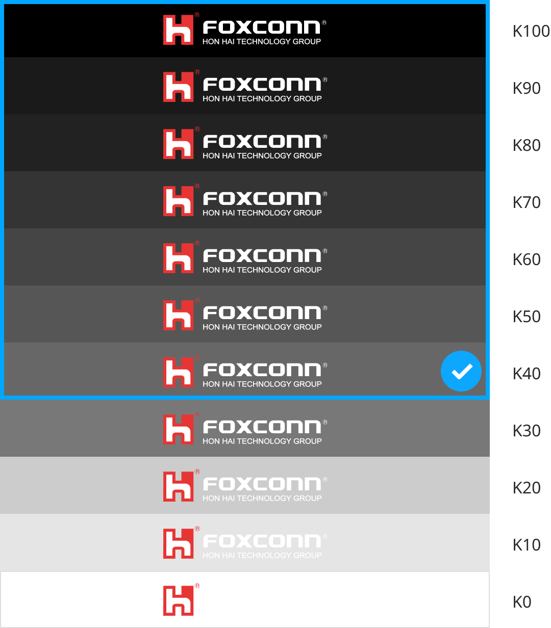标准红:由集团经营理念爱心、信心、决心所凝聚的红色,亦象征着鸿海人的精神态度。